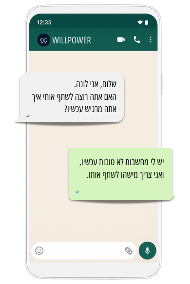 המיזם החברתי "WILLPOWER" מציע תמיכה רגשית מיידית למניעת אובדנות באמצעות צ'אט־בוט חכם בוואטסאפ, המבוסס על בינה מלאכותית (AI). הפלטפורמה מהווה קו תמיכה ראשוני לאנשים החווים מצוקה, בדידות או משבר רגשי, ומבוססת על עקרונות SAFE-T ו-CBT, שהוכחו כשיטות יעילות לתמיכה במצבי סיכון. השירות אנונימי, זמין ונגיש, ומאפשר לכל אדם לקבל הקשבה ראשונית והכוונה מיידית — בלי צורך להתקשר, להיחשף או להמתין.